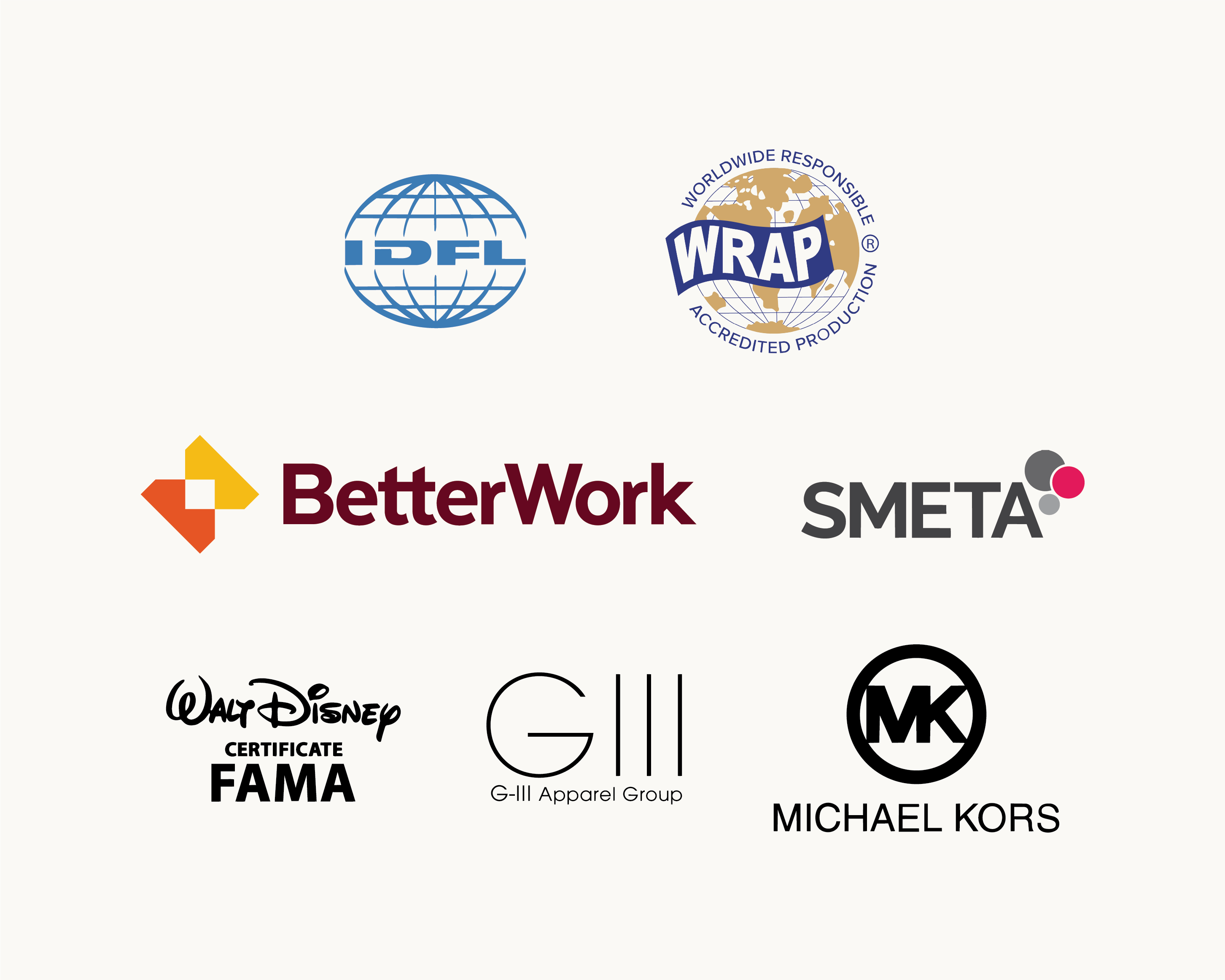 Lalafactory는 WRAP, SMETA, Walt Disney FAMA, G-III Apparel Group, Michael Kors 등 세계적인 기업들의 엄격한 감사(Audit)를 통과한, 글로벌 기준을 충족하는 검증된 생산 공장입니다.